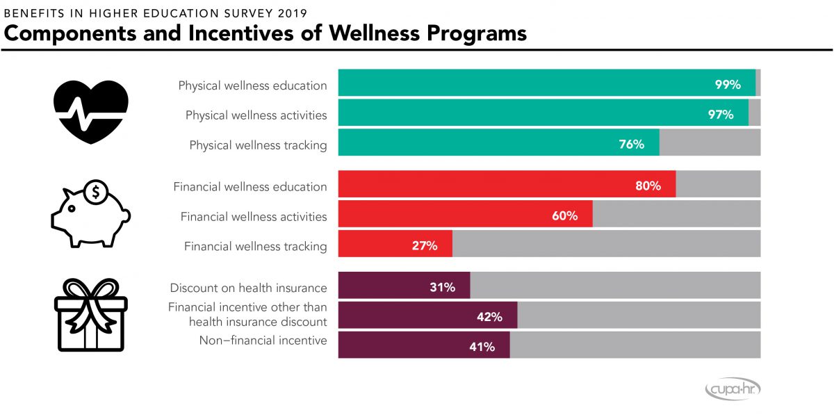 CUPA-HR collects data on wellness programs every other year in its Benefits in Higher Education Survey. Findings from the 2019 report found that while the percentage of institutions with wellness programs has not changed much over the past two years, budgets and staff dedicated to wellness programs are on the decline.