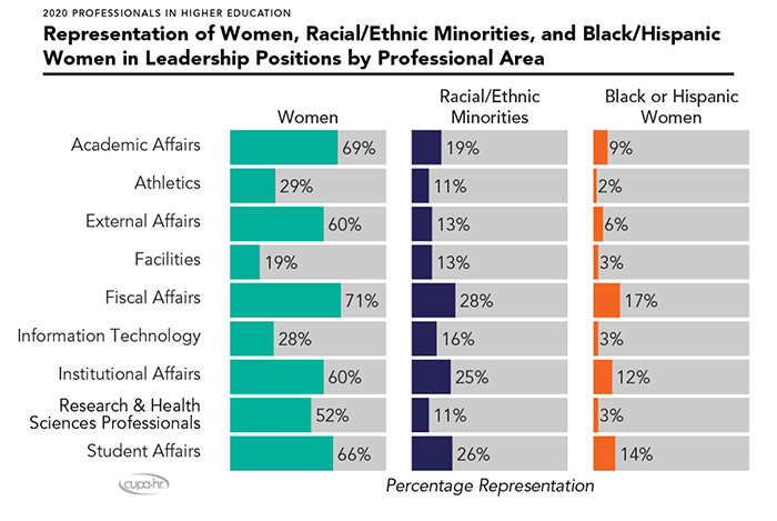 - Women represent 60 percent of higher ed professionals, and racial/ethnic minorities make up 23 percent. This representation varies by professional area. Women are not well represented in the areas of facilities (21 percent), information technology (27 percent), or athletics (30 Professionals Reportpercent). Racial/ethnic minorities are not well represented in the areas of external affairs (5 percent), facilities (5 percent) or athletics (7 percent).