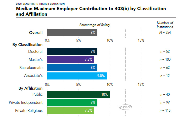 The 403(b) plan is the most popular retirement plan for both private institutions (where 92 percent offer it) and public institutions (where 95 percent offer it). The median maximum employer contribution is 8 percent of the employee’s salary, though associate’s institutions have a median employer contribution of 9.5 percent.