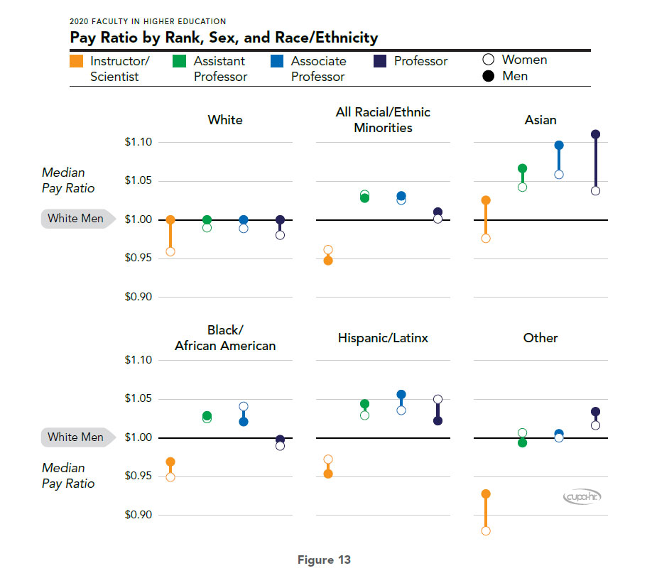 Additionally, the pay gap between women and White men is exacerbated at the rank of professor, as well as with Asian individuals across ranks. On the other hand, racial/ethnic minorities tend to be paid equitably or more than equitably compared to White men, except at the rank of instructor, where they tend to be paid less equitably.