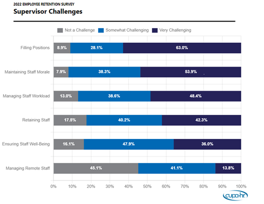 Filling positions and maintaining morale are supervisors’ top challenges. As shown in the figure below, almost two-thirds (63 percent) of supervisors indicated they find filling positions very challenging and over half (54 percent) found maintaining staff morale very challenging.