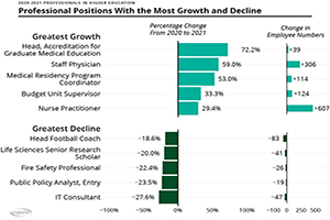 The higher ed professional workforce decreased slightly in size during the pandemic, though certain positions saw notable increases. According to CUPA-HR’s 2021 Professionals in Higher Education Annual Report released today, the number of full-time exempt higher ed employees decreased by 0.4 percent in the last year (2020-21), compared to an overall 4.4 percent increase in the prior year.
