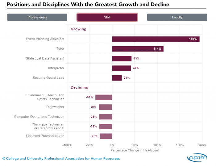 A new interactive graphic from CUPA-HR shows the Positions and Disciplines With the Highest Growth and Decline for higher ed professionals, staff and tenure-track faculty.