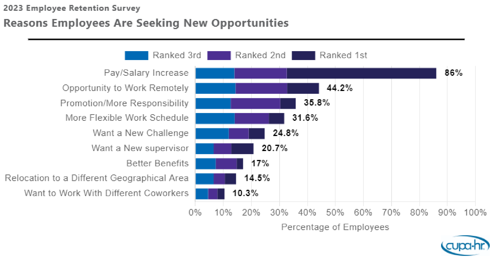 According to the findings, respondents say that pay is the number one reason they’re looking for a new job. Other influential reasons are an opportunity to work remotely, desire for a promotion or more responsibility, and the need for a more flexible work schedule.