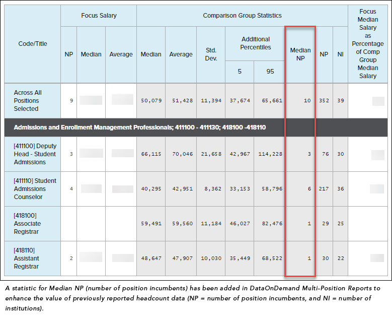 Data from institutions at your expected future enrollment or budget level can provide a roadmap for how smaller institutions manage staffing levels overall, and for individual functional areas. To empower HR professionals to make data-driven decisions about changes to staff and faculty size, CUPA-HR has developed a new statistic in DataOnDemand Multi-Position Reports (for professionals and staff) and Multi-Discipline Reports (for faculty) — the median number of position incumbents per institution. This statistic will tell you how many employees the typical institution in your comparison group employs within each position. Compare a group of positions you consider to be part of a functional area, and you gain the ability to benchmark staff size for each individual functional area or department on campus.