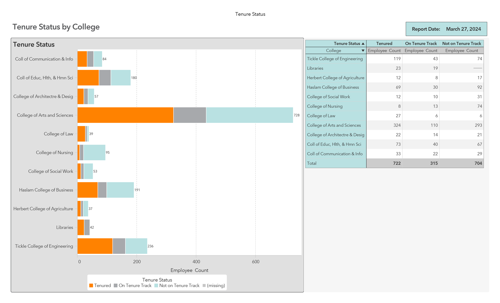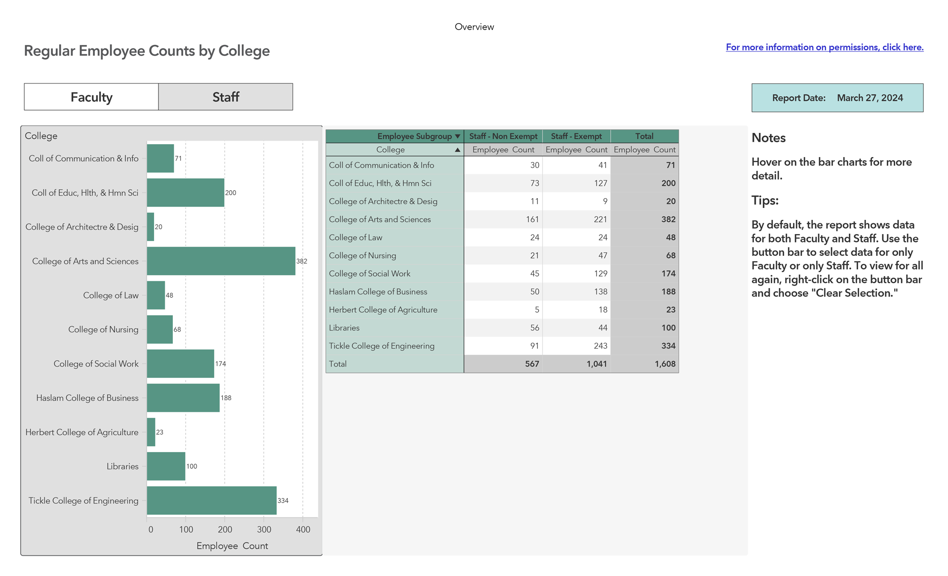 Once we had reports ready to roll out to our campus, we needed to determine who would have access to the specialized reports. We had determined early on that we only wanted certain parts of the dashboard available to an external audience and other parts would be available to internal partners through a secure login. Security of the data on the dashboard was a high priority. As we worked through this security process, we realized that the provost needed to have overview reports of the data for all the colleges, which we did not identify during the scoping phase of the project. This realization prompted the development of the provost module. The image below provides the headcount of regular faculty and staff by college. This gives the provost’s office a snapshot of staffing levels.