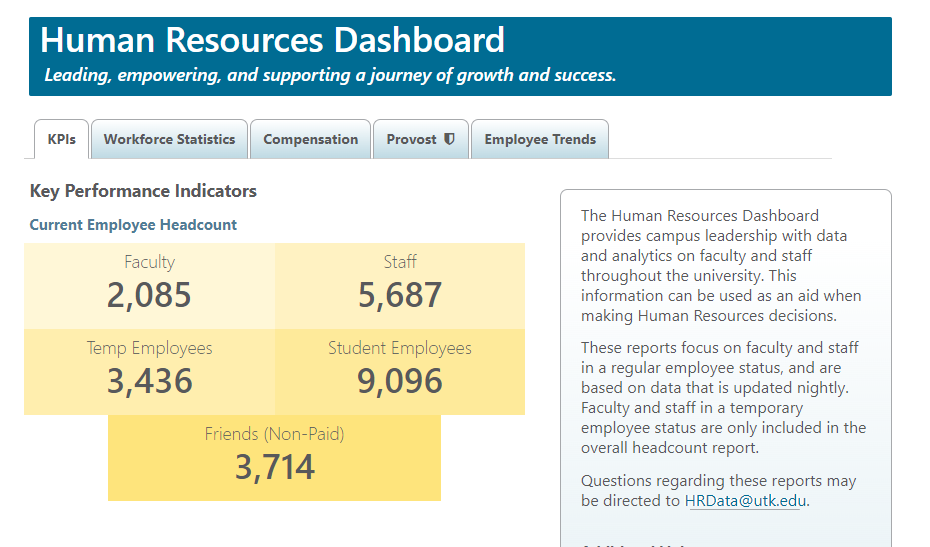 Often, departments need information about their employees that is hard to obtain at the unit or college level and can only be obtained through a central HR office. And those in the central HR office may even find that the sources of data needed to answer the unit or college request are clunky, don’t communicate well, or are questionable in terms of accuracy! The beauty of a dashboard is that it pulls from many different sources of data, requires a data assurance phase (to make certain the data is accurate), and displays those sources of data all in a single visual representation.