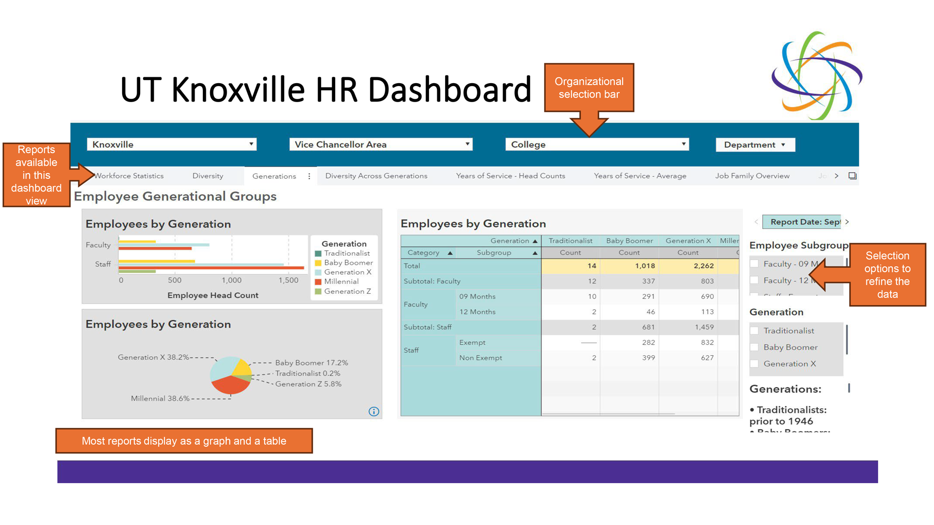Here you’ll see some examples from UT Knoxville’s HR dashboard. Below is the external-facing landing page that provides overall metrics for our campus. Information about diversity, a snapshot of employee generational groups and years of service are also included on the landing page.