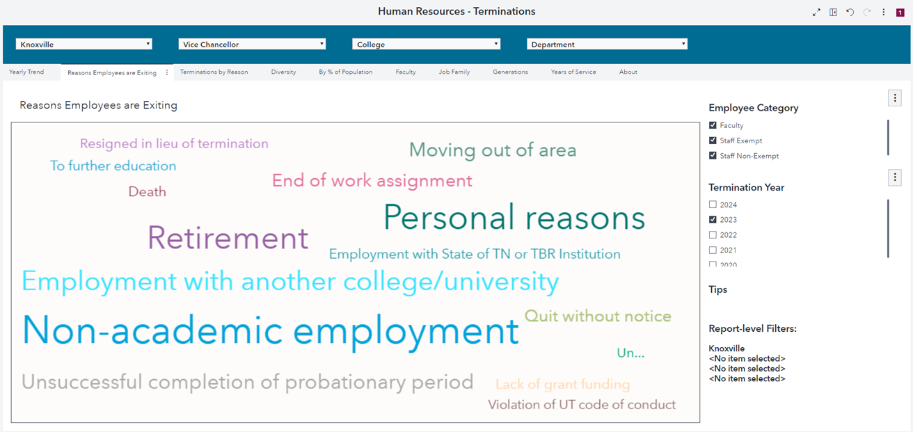 OIT developed a database to store data extracted from the human resources information system. We established a weekly meeting cadence with our IT partners. The meetings provided a space to discuss data issues, metrics calculations and graphic display options. SAS software functionality evolved over the course of the project, so our IT partners provided new options to display data. In one instance, word cloud technology became available, and we found this to be a meaningful way to display reasons employees were exiting the university. There were also times when the graphic display did not meet our needs, and we asked IT to make adjustments. For example, we found that a bar graph did not adequately tell the story of our termination data, so our IT partners identified the word cloud option seen below. Throughout the project we tested the data and calculations for accuracy and made adjustments as necessary.