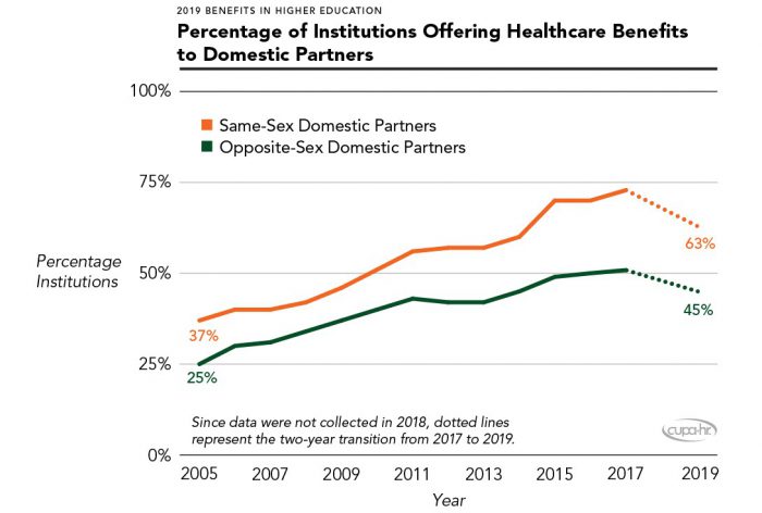 According to recent research by the College and University Professional Association for Human Resources (CUPA-HR), this year marks the first time since 2005 that there has been a decrease in healthcare benefit offerings for domestic partners at higher education institutions — both for same-sex (10 percentage-point decrease since 2017) and opposite-sex (6 percentage-point decrease since 2017) partners. CUPA-HR’s 2019 Healthcare Benefits for Higher Education Employees Survey also found that the gap between healthcare offerings for same- and opposite-sex partners has shrunk from 22 percentage points in 2017 to 18 percentage points in 2019.