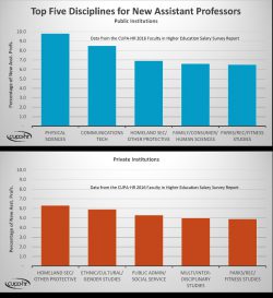 - New assistant professors make up 3.5% of the faculty at private institutions and 4.2% of the faculty at public institutions. The top discipline for new assistant professors (as measured by the percentage of new assistant professors in each discipline) at public institutions is “Physical Sciences” and at private institutions is “Homeland Security, Law Enforcement, Firefighting and Related Protective Services.”