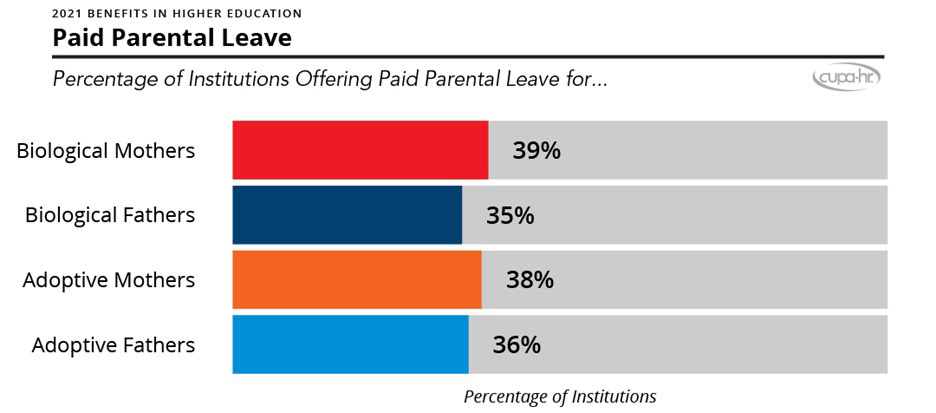 Fewer than 40 percent of higher ed institutions offer paid parental leave to new parents, according to the CUPA-HR 2021 Benefits in Higher Education Annual Report. The report, released today, examines the benefits offered to higher ed employees, including healthcare plans, wellness programs, paid time off, tuition benefits and retirement.