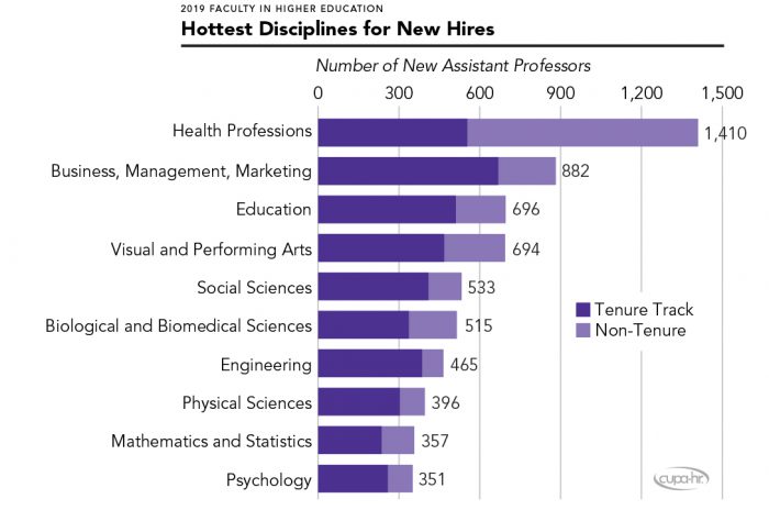 The hottest discipline for new faculty hires, with 1,410 new assistant professors hired in the past year, is health professions, which is also the highest-paying discipline for non-tenure teaching faculty. Among the disciplines that saw the fastest growth rate in hires of new assistant professors, architecture (73 percent) and natural resources and conservation (72 percent) topped the list.