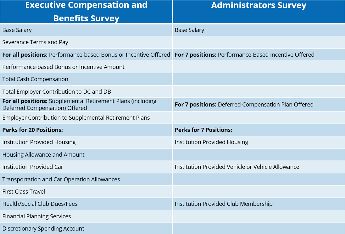 CUPA-HR's Administrators in Higher Education Survey provides data mainly on base salary, whereas our Executive Compensation and Benefits Survey provides comprehensive compensation data including base salary, bonuses, total cash compensation, retirement plan contributions, and expanded perks. Here is a visual representation of the data provided by the Executive Compensation and Benefits Survey versus the Administrators Survey: