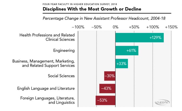 The impact of the recession was not the same for all academic disciplines, however. The three disciplines that had the most hiring growth from 2004 to 2018 were health-related professions, engineering, and business. In contrast, the three disciplines with the largest hiring decrease over the same time period were foreign languages/literatures, social sciences, and English language/literature (Figure 8). These trends in faculty hiring by discipline mirror increased student enrollment in these disciplines.