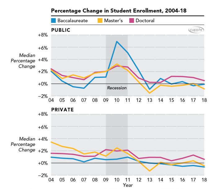 The 2008 economic recession had profound impacts on both students and faculty in higher education. The results of this report suggest that the overall impact of the economic recession on college student enrollment was positive during the recession. Student enrollment increased during the recession at all types of institutions. The largest percentage increase occurred at public baccalaureate institutions in 2010. After the spikes, however, institutions experienced a decrease in enrollment change in 2012 and 2013. For all but doctoral institutions, these decreases resulted in a period of negative enrollment change post-recession.