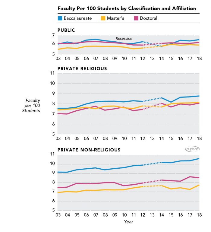 Different types of institutions responded to the economic recession differently. Public institutions — which were more affected by decreases in government support — hired fewer new full-time faculty and more part-time faculty to handle increased student enrollment, and public doctoral institutions have continued to increase the utilization of part-time faculty post-recession. The ratio of full-time faculty to students in public institutions has remained relatively unchanged. On the other hand, private institutions — less reliant on state and federal support — increased their full-time faculty-student ratio from 2003 to 2018. Private baccalaureate and master’s institutions have maintained a steady percentage of part-time faculty post-recession.