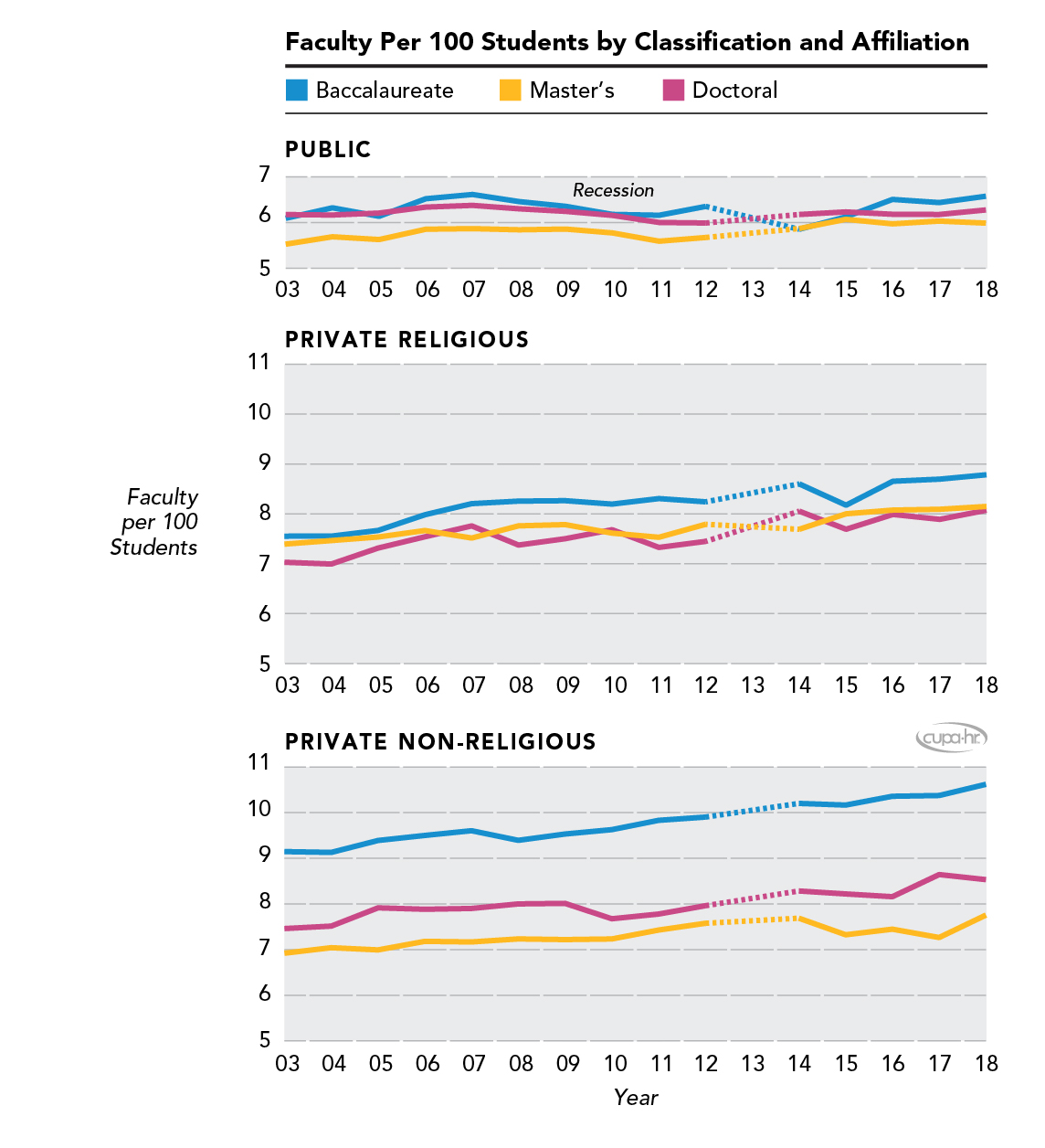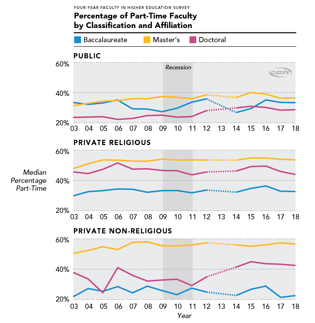 Figure 4 shows the number of full-time equivalent (FTE) faculty per 100 FTE students by institution classification and affiliation.12FTE faculty refers to both tenure-track and non-tenure-track faculty. Most institutions calculated their FTE for faculty and students and reported to CUPA-HR. If not reported, FTE for faculty is calculated as the number of full-time faculty plus one-third of part-time faculty. FTE for students is calculated in the same 2013 data were not included due to a change in survey questions in that year that makes comparisons incompatible. Faculty-student ratios have historically been substantially higher in private institutions than in public ones, and we see this definitively in our data (Figure 4). Private non-religious baccalaureate institutions in particular had the highest faculty-student ratio among all types of institutions for the entire period displayed, 2003 to 2018. Also depicted in the graph are the differences in post-recession response in regard to faculty-student ratio. For public institutions, the response was to decrease the number of faculty they retained or hired in proportion to their student size, and recovery of pre-recession faculty-student ratios has been slow. Most private institutions were able to maintain or even slightly increase their faculty-student ratio during the recession. For those private institutions that did show a slight decrease during the recession, recovery of their faculty-student ratios was rapid, and they have been increasing steadily ever since.