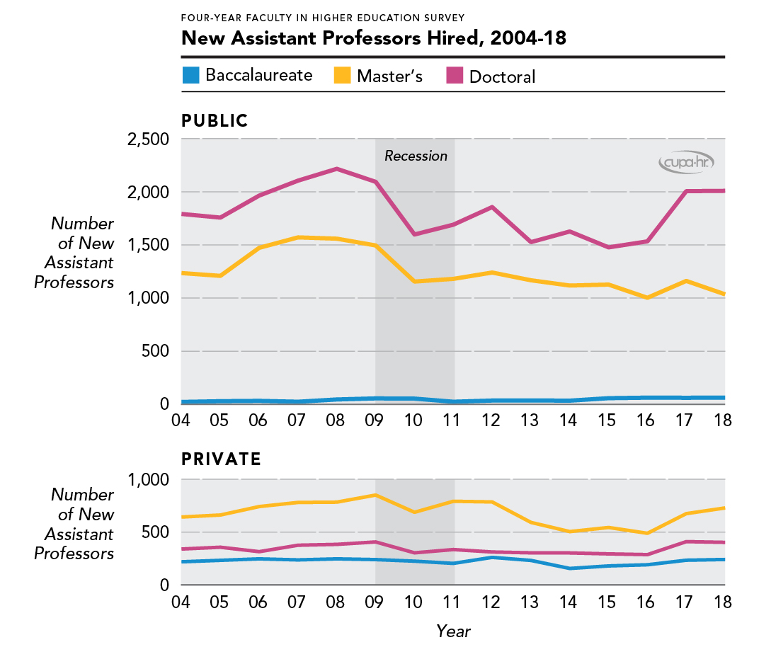 Prior to 2008, new hires of full-time faculty were rapidly growing at master’s and doctoral institutions. After the recession, there was a notable decline in new assistant professor hires, and this decline continued until 2016, when institutions began to increase new hires, suggesting this may have been the point of recovery. In contrast, new assistant professor hires at baccalaureate institutions remained relatively steady (and low) over this entire period.