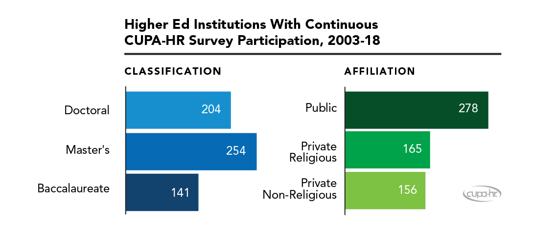 8 Associate’s institutions were not included, as their participation history was not consistent. Data were collected as part of CUPA-HR’s surveys of administrators, professionals, staff, and faculty in higher education from 2003-18. In this report, “year” refers to the year the academic year ends. For example, 2003 designates academic year 2002-03, and 2018 designates academic year 2017-18.