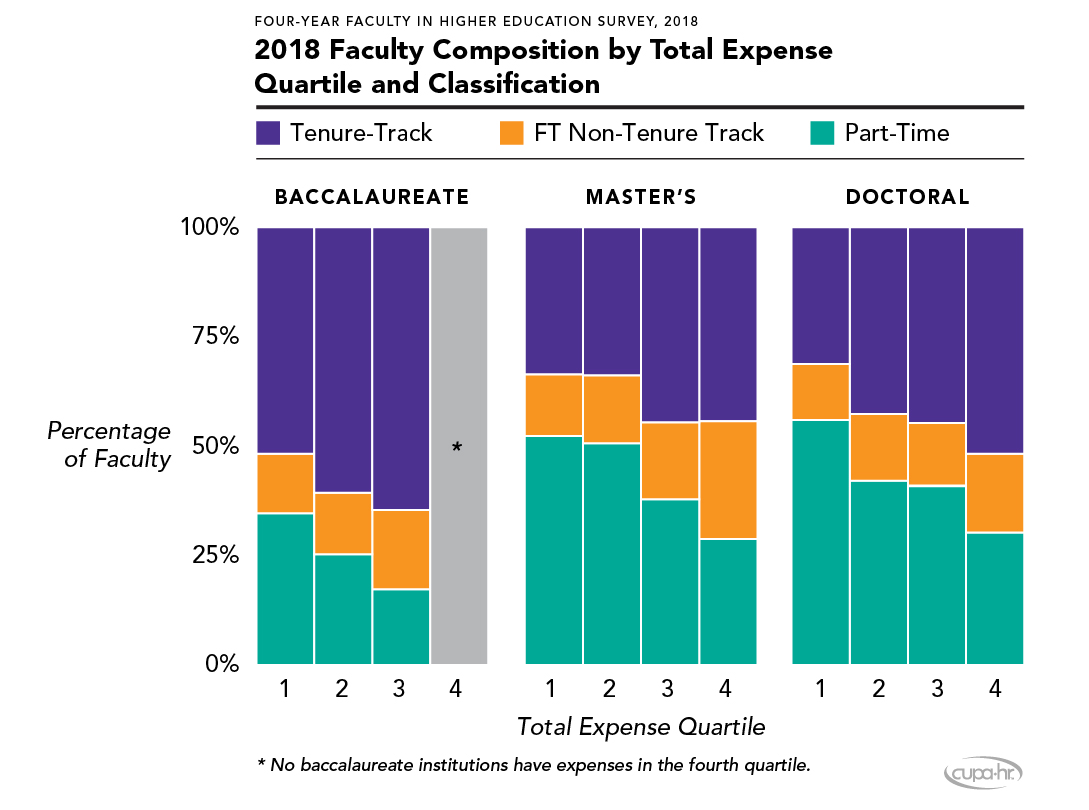 It may be the case that the level of an institution’s use of PT faculty is determined by its financial status (as measured by total expenses). Institutions with greater resources might choose to hire more FT faculty, whereas those with fewer resources might choose to hire more PT faculty. Therefore, we looked at faculty composition (FT tenure-track, FT non-tenure-track, PT) by total expense quartile and classification in our most current (2018) data (Figure 6).22Institutions in the first expense quartile (Q1) are institutions with total expenses reported to IPEDS in the 2017 Spring Finance Survey of less than 74 million; Q2 institutions have total expenses greater than 74 million but less than 142 million; Q3 is greater than 142 million but less than 357 million; and Q4 is greater than 357 million. Note: No baccalaureate institutions have total expenses in Q4.