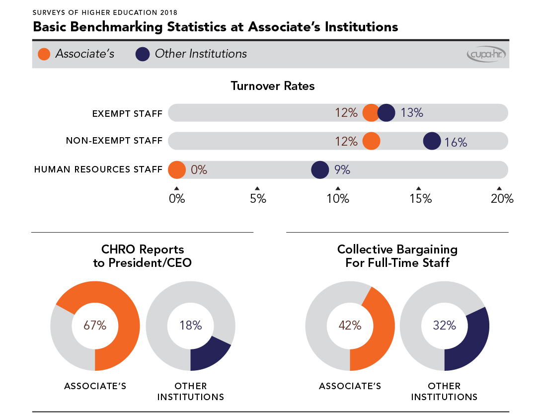 6 The turnover rate of 0% for HR staff is anomalous for this year (and all turnover rates should be viewed in context). For example, for the year prior (2017), associate’s institutions had an HR staff turnover rate of 11%. All data in Figure 3 were collected in the Institutional Basics section of CUPA-HR’s 2018 Surveys of Higher Education. Specific questions for this section can be found in any Survey Participation and Information Template at the preceding link. Data were analyzed using the Benchmarking Report in DataOnDemand.