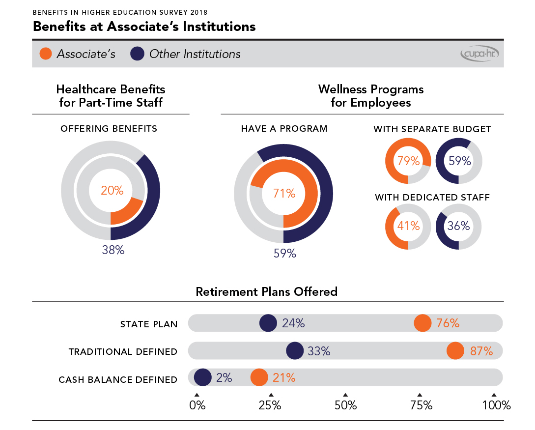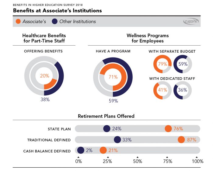 In addition, three out of four associate’s institutions are part of a state employee retirement plan, compared to only one in four non-associate’s institutions. Associate’s institutions are also much more likely than other institutions to offer a defined benefits plan, either in a traditional or cash balance form.