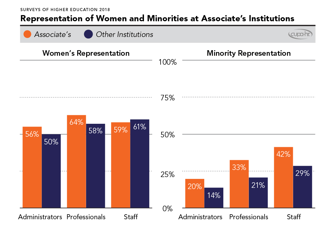 In nearly every category, associate’s institutions do a better job than other institution types in representing and paying women and racial/ethnic minorities in various staff roles (administrators, professionals, and non-exempt staff). Associate’s institutions have better representation of women in administrative and professional positions and better representation of minorities across all positions (Figure 5).8All data in Figure 5 were collected in CUPA-HR’s 2018 Surveys of Higher Education for administrators, professionals, and staff. Specific questions and position descriptions for these surveys can be found in the Survey Participation and Information Templates at the preceding link. Data were analyzed using the Demographic Reports in DataOnDemand.