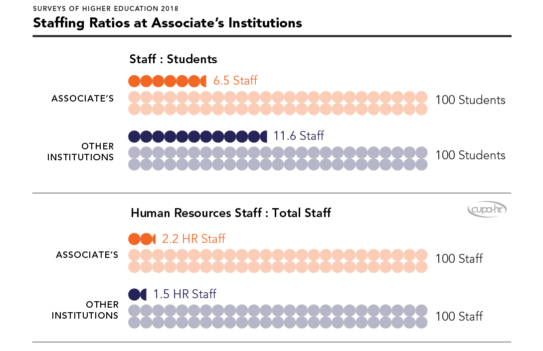 Associate’s institutions have a lower ratio of staff to students (Figure 2). However, they also have a proportionally greater number of HR staff compared to other institutions. Per 100 total staff, associate’s institutions have 2.2 HR staff, compared to 1.5 staff at other institutions.5All data in Figures 1 and 2 were collected in the Institutional Basics section of CUPA-HR’s 2018 Surveys of Higher Education. Specific questions for this section can be found in any Survey Participation and Information Template at the preceding link. Data were analyzed using the Benchmarking Report in DataOnDemand.