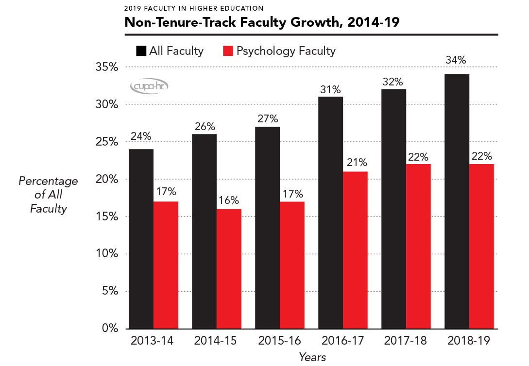 - The growth in non-tenure-track faculty as a proportion of all faculty has not been as steep for psychology faculty in comparison to other disciplines. Psychology has maintained relatively low numbers of non-tenure-track faculty.