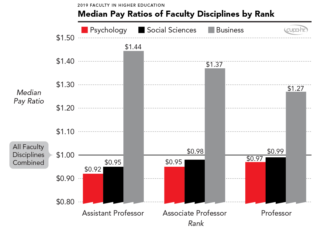Figure 1 depicts the pay ratios of selected faculty disciplines compared to what faculty from all disciplines combined are paid.5Data displayed are for full-time, tenure-track faculty. Pay ratios are derived by dividing the median salary of all faculty combined by the median salary of faculty from the designated discipline. Psychology faculty with all ranks combined are paid $0.92 on the dollar compared to faculty from all disciplines. Their salaries are also lower than faculty in the social sciences. This disparity exists at each rank but is most notable at the rank of assistant professor. In contrast, faculty in business are paid well above the all-disciplines-combined level at every rank.6To view salaries from other faculty disciplines, see results available in DataOnDemand or the Faculty in Higher Education Annual Report.