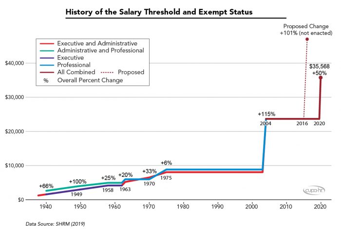 On September 24, 2019, DOL set the new salary threshold at $35,568 per year (Figure 1).5Society for Human Resource Management (2019). Timeline: Overtime Rule History (Online Article). Employers have until January 1, 2020, to comply.