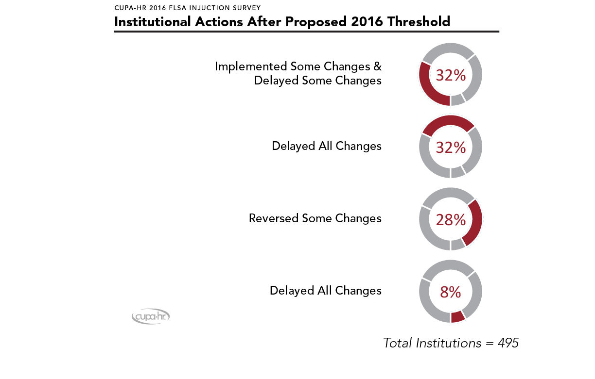 In December 2016, CUPA-HR collected data in the FLSA Injunction Responses Survey to identify the number of institutions who were in one of four distinct categories: those who planned to move forward with implementing some changes while delaying other changes, those who decided to delay all changes, those who moved forward with implementing all changes, and those who planned to reverse some changes (Figure 2).
