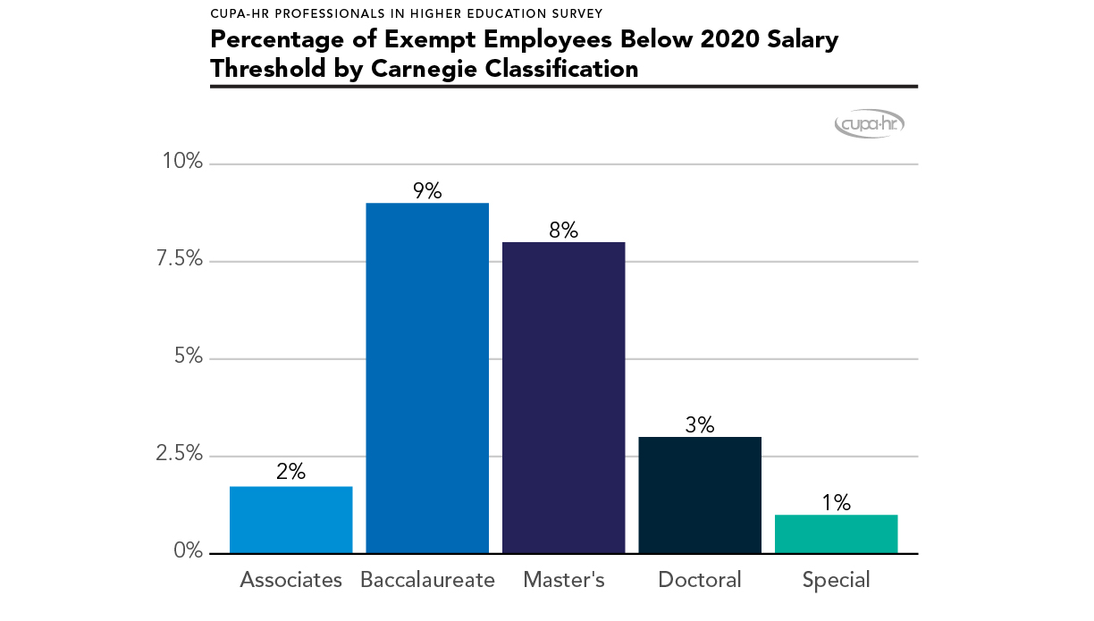 Around 5% of professional exempt employee salaries currently fall below the new salary threshold of $35,568 per year.7Ibid. Figure 3 identifies the percent of exempt professional employees in each Carnegie classification who are paid below the new salary threshold, suggesting that baccalaureate and master’s institutions have the most exempt employees who were paid below the threshold at the start of the 2018-19 academic year.