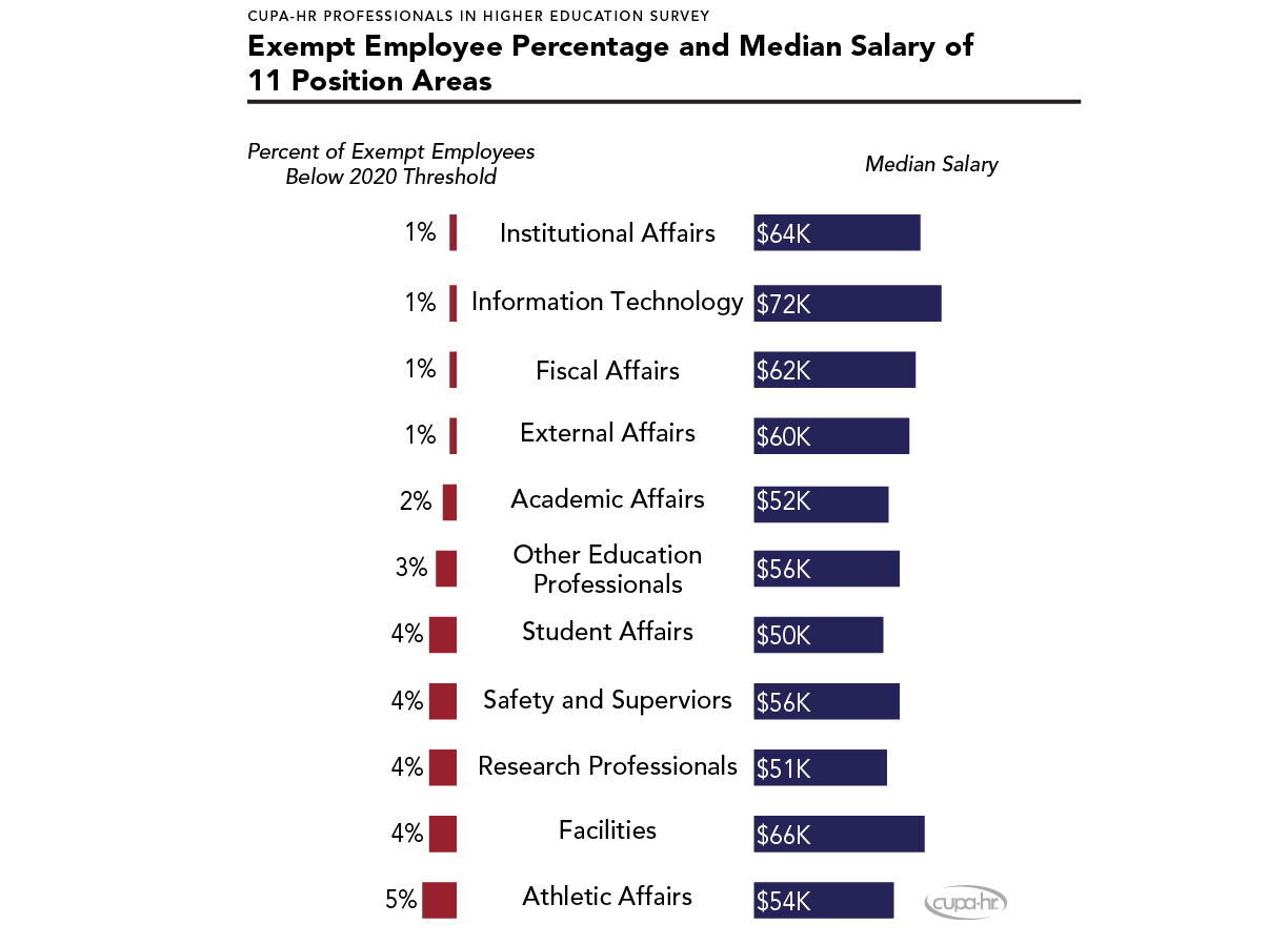 To further examine the impact of the new salary threshold, 11 position areas were identified as being the most impacted due to the salary threshold changes.8Bichsel, J., Pritchard, A., & McChesney, J. (2019). Professionals in Higher Education Annual Report: Key Findings, Trends, and Comprehensive Tables for the 2018-19 Academic Year (Research Report). CUPA-HR. These position areas include: Student Affairs, Research Professionals, Academic Affairs, Athletic Affairs, Safety and Supervisors, Other Education Professionals, External Affairs, Fiscal Affairs, Institutional Affairs, Facilities, and Information Technology.