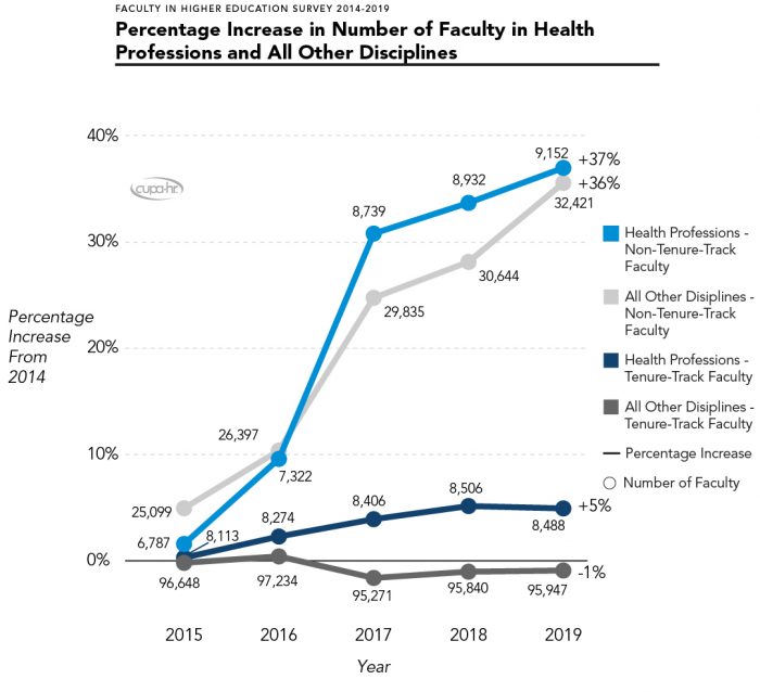 From 2014 to 2019, the number of full-time health professions faculty positions increased faster than faculty in all other disciplines combined, with most of the growth occurring between 2015 and 2017. Most of the increase in full-time health professions faculty positions occurred through the addition of non-tenure-track positions. Health professions joined many other disciplines that added higher percentages of non-tenure-track than tenure-track positions from 2014 to 2019.