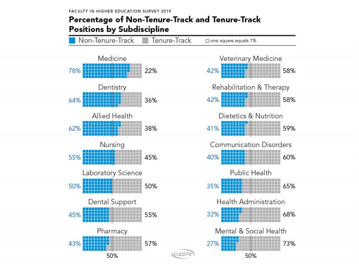 Higher concentrations of non-tenure-track faculty in medicine and dentistry may reflect more modern compensation practices that allow faculty to conduct private practice in addition to their academic appointment. Higher concentrations of non-tenure-track faculty in medicine and dentistry also reflect decades-long increases in the proportion of faculty in these fields who hold clinician-educator positions. Clinician-educator positions are typically non-tenure-track and emphasize excellence in teaching and clinical practice over basic research and obtaining external funding. Conducting research, and clinical research in particular, can still be an important aspect of these positions, but basic science is usually less emphasized than in tenure-track positions. The proportion of clinician-educator positions continues to grow, perhaps for two reasons: 1) they do not require faculty to achieve excellence in all three areas of research, teaching, and practice; and 2) these positions can also provide revenue for institutions through the delivery of clinical services.13Costello, B.J.; Marshall, K.L.; Schafer, T.; Phillips, S.; & Hart, T.C. (2013). The Utility of Hybrid Promotion and Tenure Tracks for Dental School Faculty. Journal of Dental Education, 77, 706-715. PMID: 23740907 , 14Steinmann, A.F.; Dy, N.M.; Kane, G.C.; Kennedy, J.I.; Silbiger, S.; Sharma, N.; & Rifkin, W. (2009). The Modern Teaching Physician – Responsibilities and Challenges: An APDIM White Paper. The American Journal of Medicine, 122, 692-697. doi: 10.1016/j.amjmed.2009.03.020 , 15Barchi, R.L., & Lowery, B.J. (2000). Scholarship in the Medical Faculty From the University Perspective: Retaining Academic Values. Academic Medicine, 75, 899-905. doi: 10.1097/00001888-200009000-00011