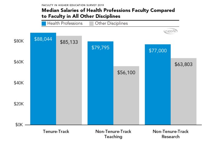 Health professions non-tenure-track positions are paid lower median salaries than are tenure-track positions, but the difference is not as great as in other disciplines.