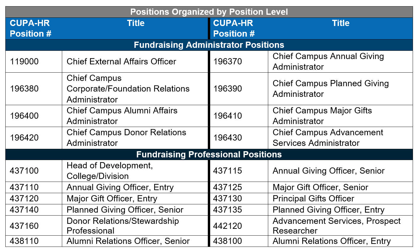 CUPA-HR collects salary and demographic data on 20 fundraising employee positions, both administrative and professional (Table 1).4For detailed descriptions of these positions, see CUPA-HR’s Administrators Survey Participation and Information Template and Professionals Survey Participation and Information Template.